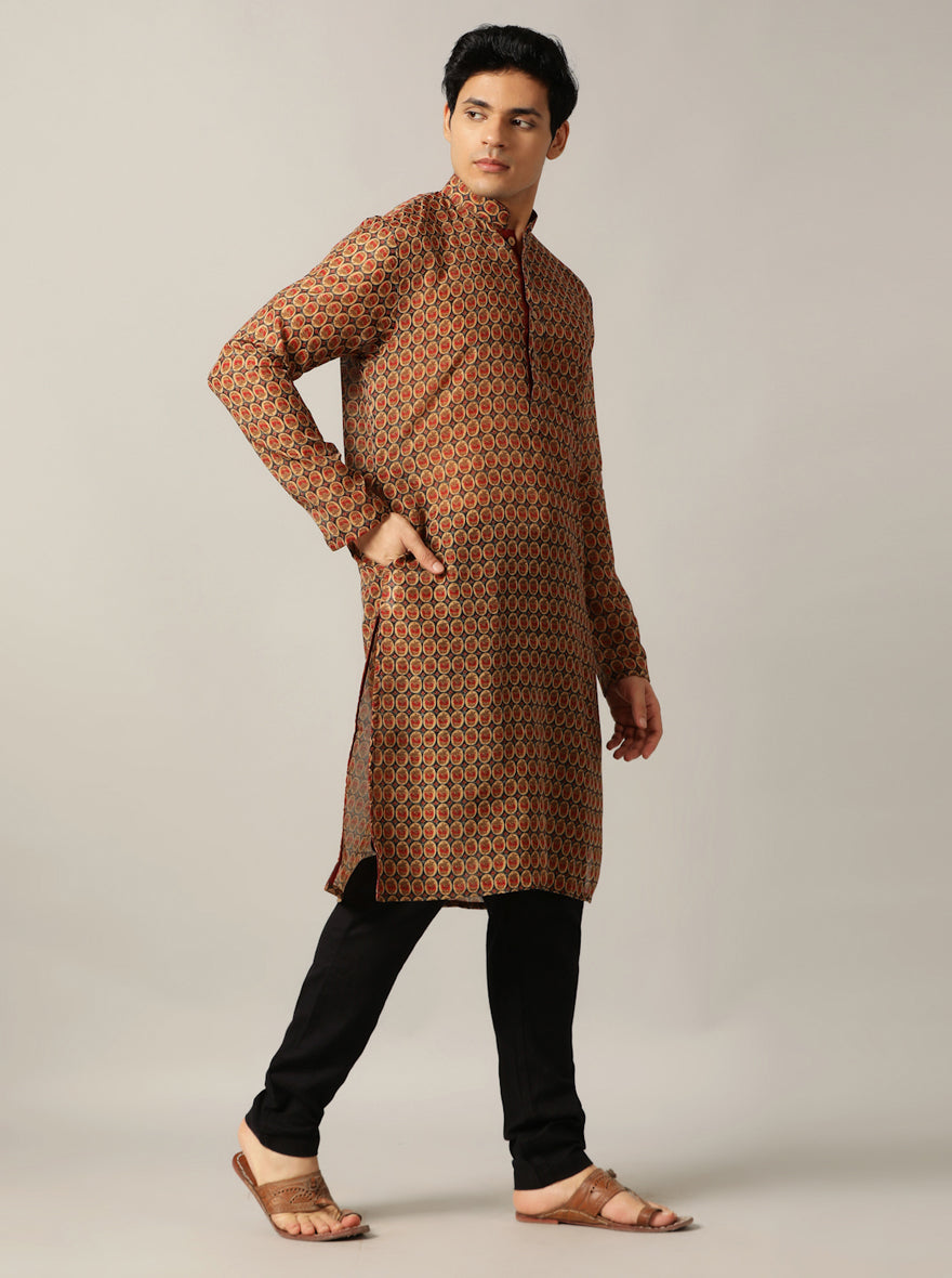 Grey & Red Printed Kurta For Men