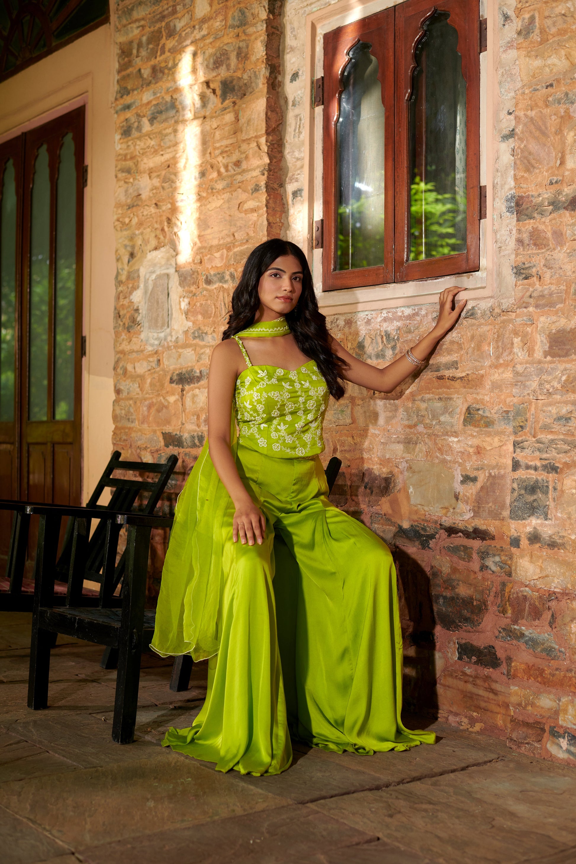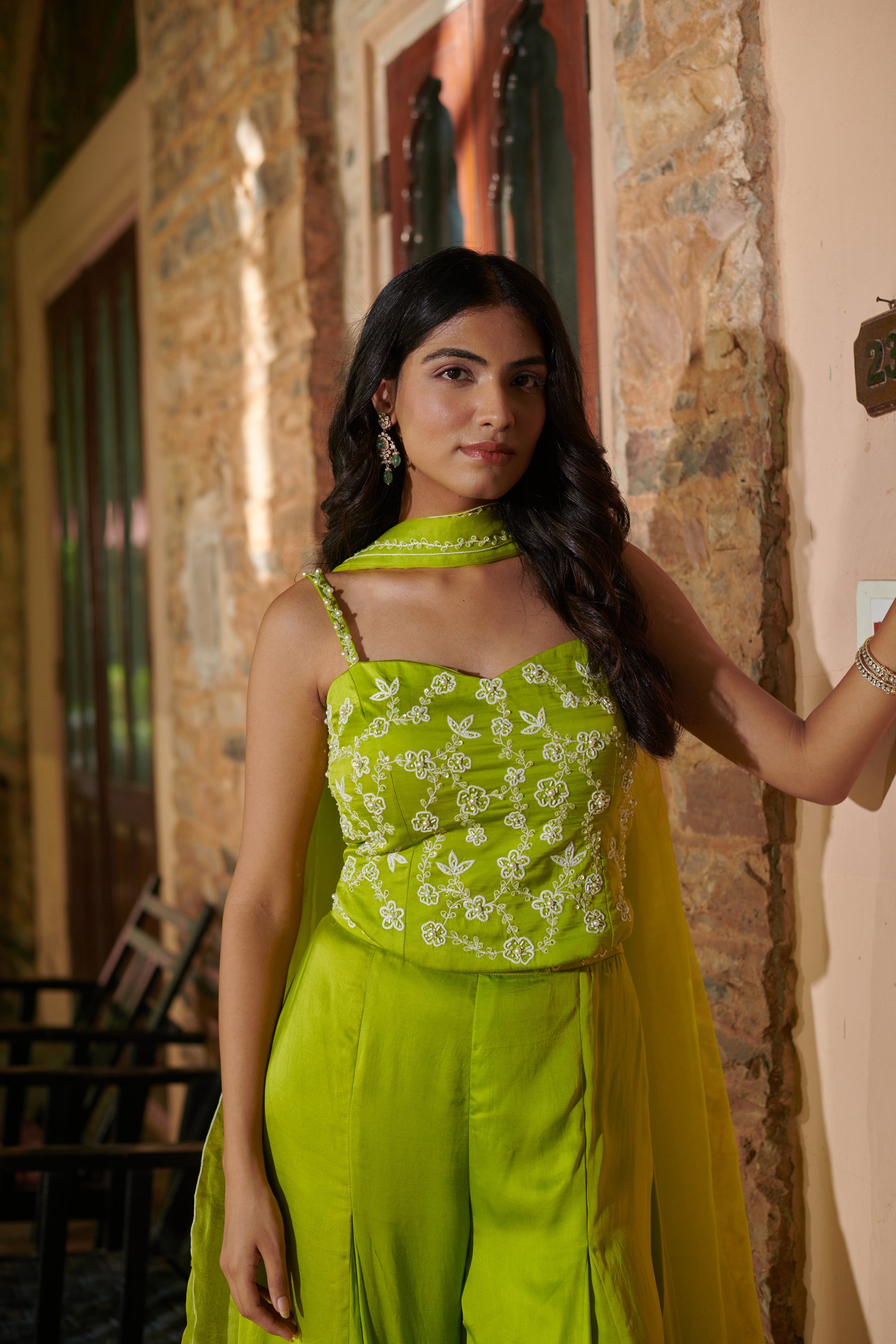The set is a breathtaking attire that exudes the lively spirit of spring. This striking lime green outfit features a beautiful hand-embroidered bodice paired with flowing palazzo pants, offering a perfect blend of contemporary style and traditional charm. The delicate floral embroidery on the sleeveless top adds a touch of femininity, while the wide-legged palazzos ensure a graceful flow with every step. Accompanied by a matching dupatta, "Haritā" is an ideal choice for daytime events or festive gatherings where you wish to stand out with elegance and poise.